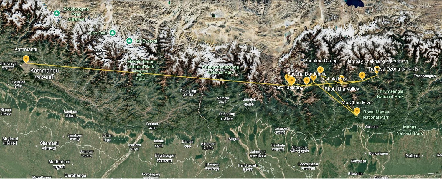 Economy class flights from Chengdu to Lhasa, Lhasa to Kathmandu, Kathmandu to Paro, & the domestic flight from Paro to Bumthang